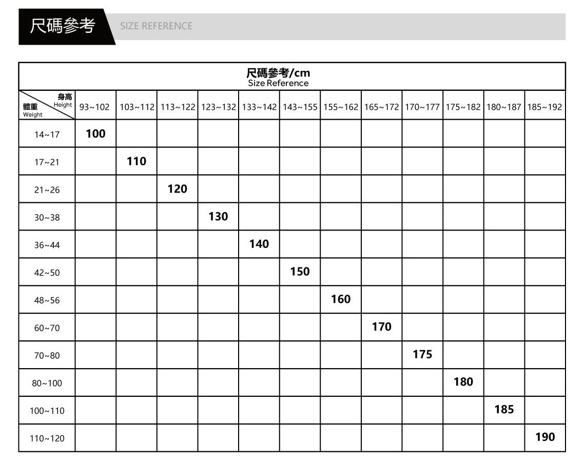 尺码 100 or 110 or 120 or 130 or 140 or 150 or 160 or 165 or 170 or 175 or 180 or 185 or 190